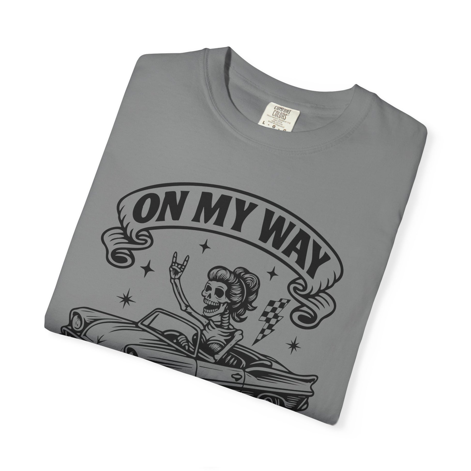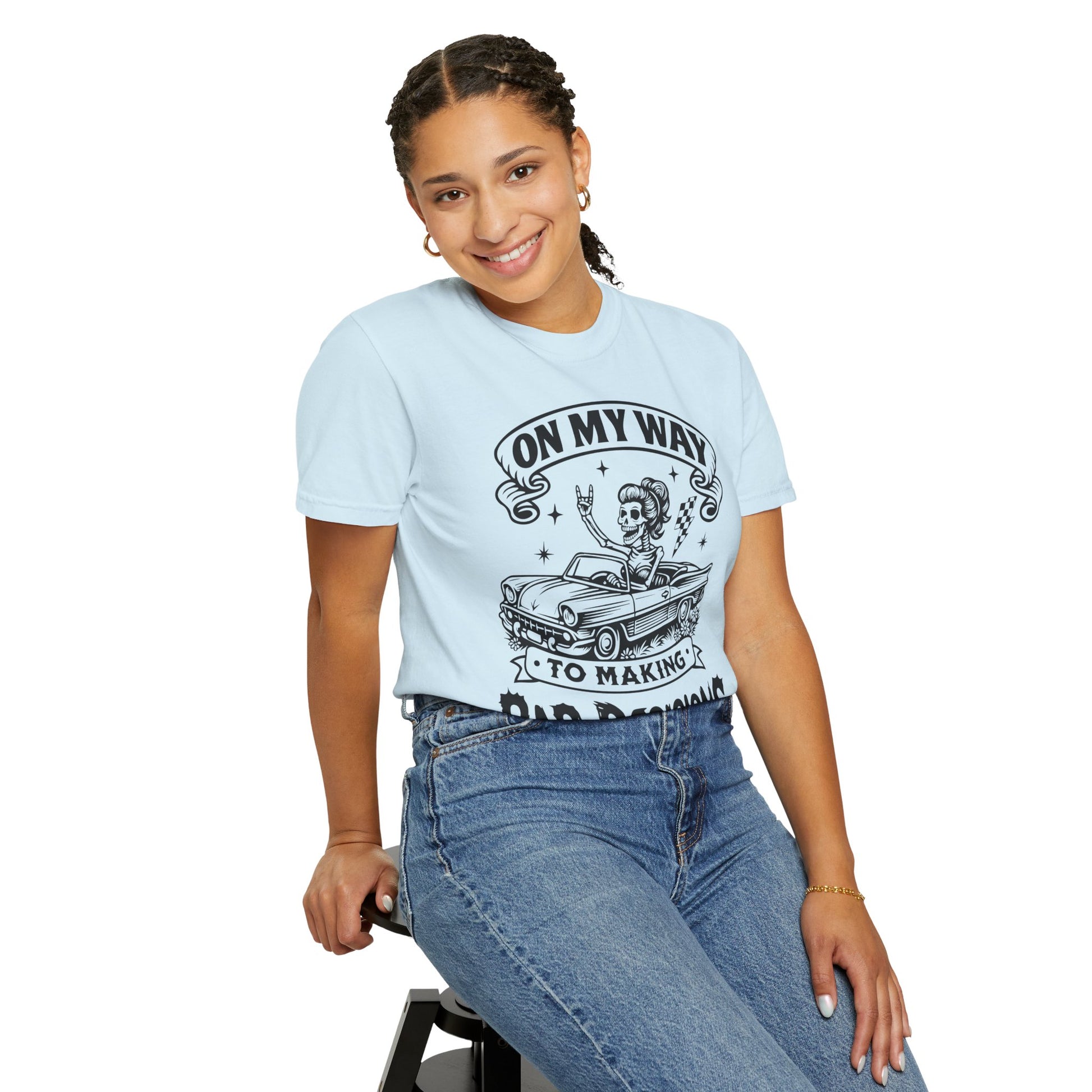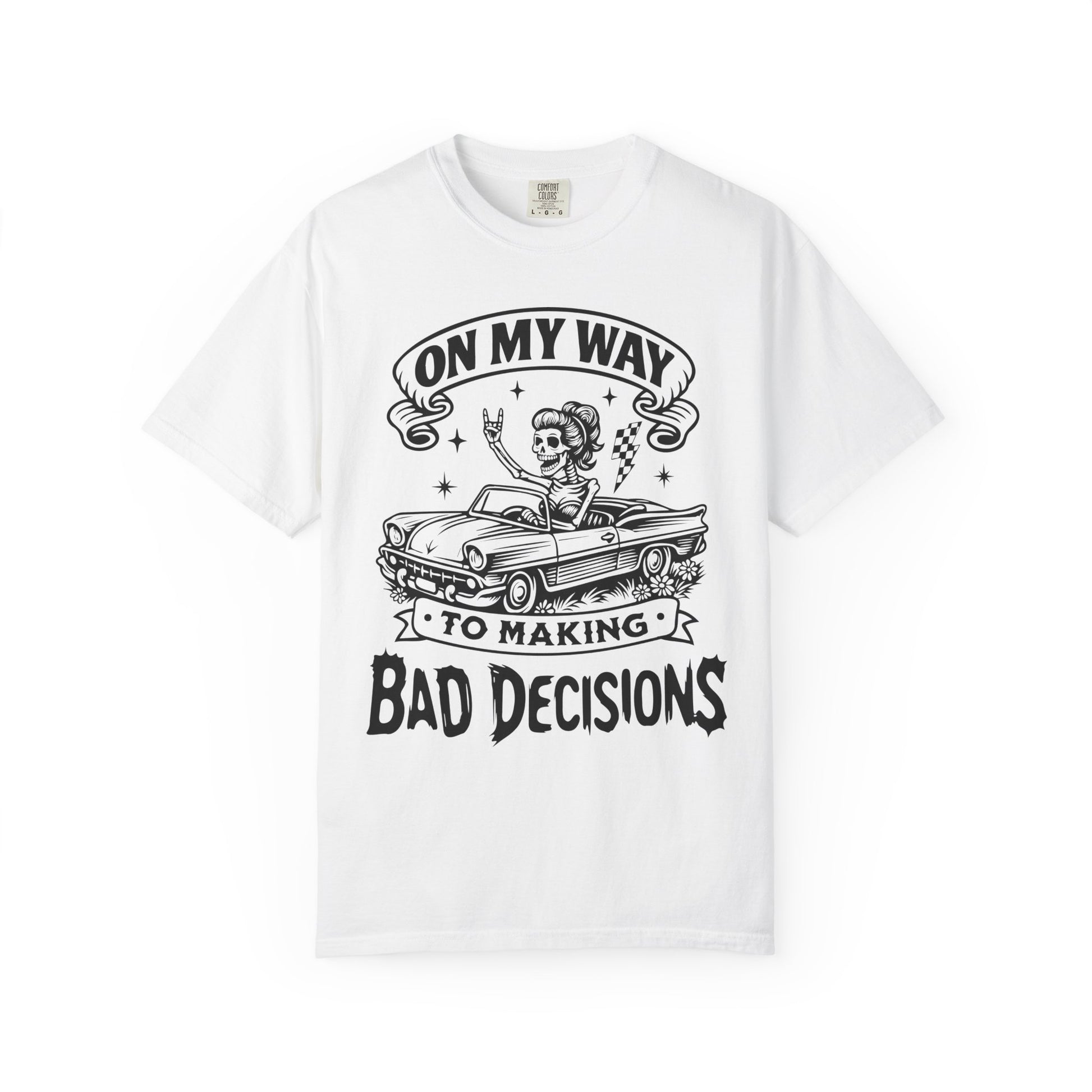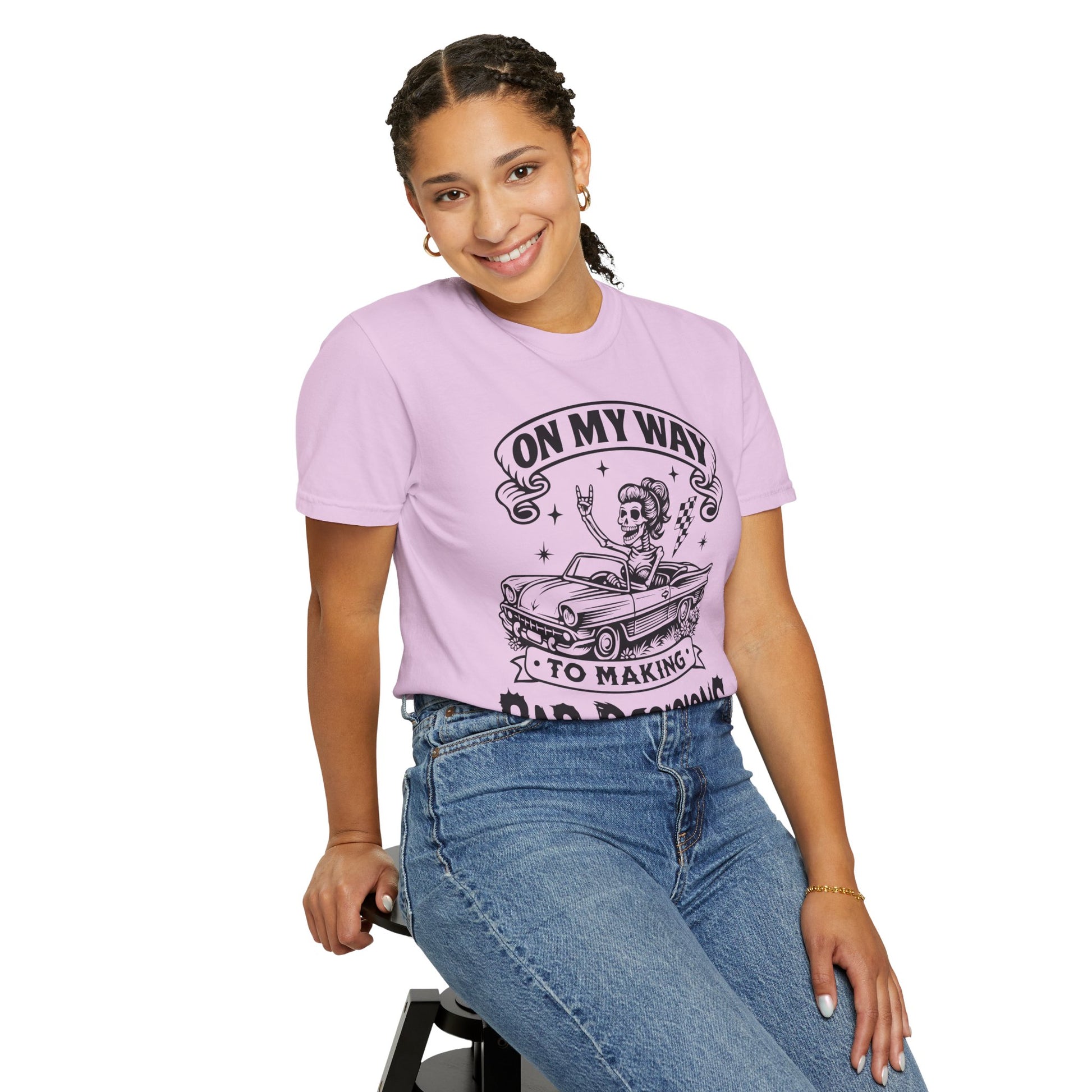This relaxed, garment-dyed tee brings a cheeky, vintage-rock vibe to your everyday rotation. The hand-illustrated front shows a retro convertible and a carefree rider beneath the banner reading “On my way to making bad decisions,” giving the shirt playful rebellious energy without trying too hard. The heavy, soft-feeling cotton and washed-in color make it feel lived-in from day one — the kind of tee you reach for when you want to be comfortable and a little mischievous. Wear it on weekend drives, backyard bonfires, or nights out with friends who get your sense of humor. It sits loose, drapes nicely, and only gets better with each wash and story added to it.